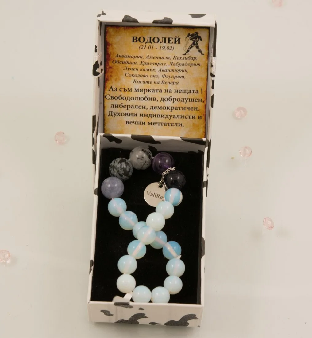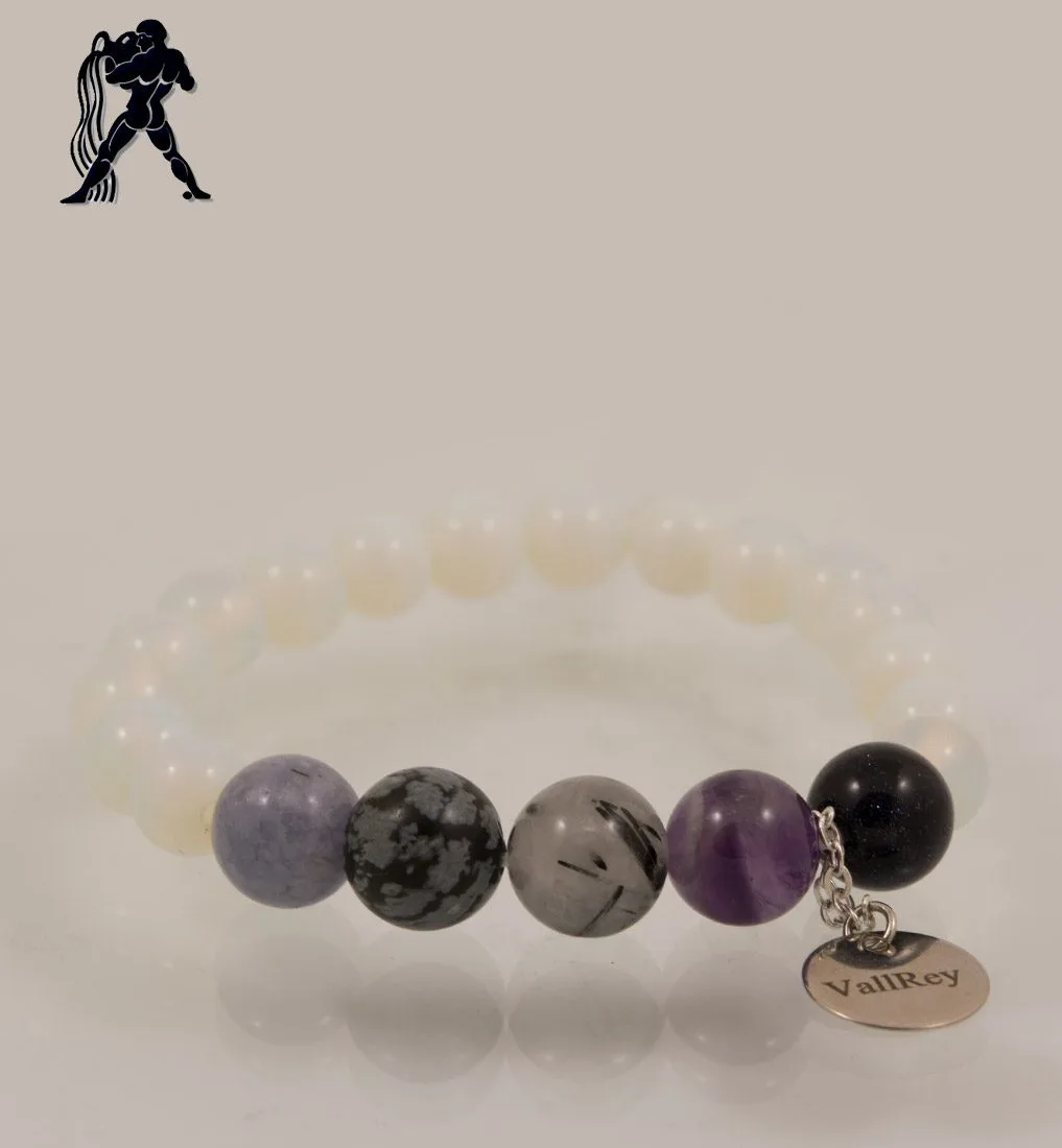 Ръчно изработена гривна за зодия водолей от естествени  камъни с фирмено стоманено лого VallRey