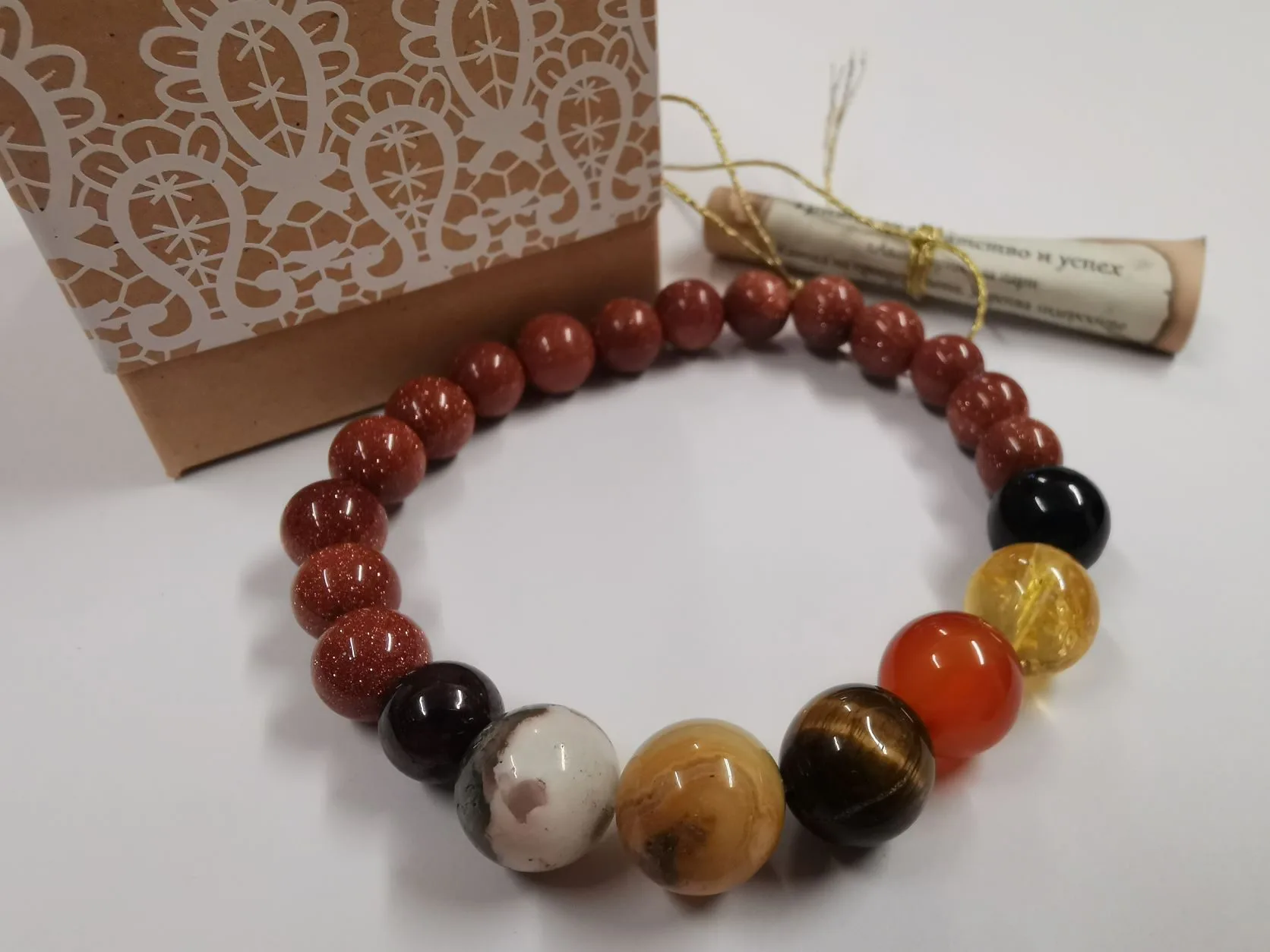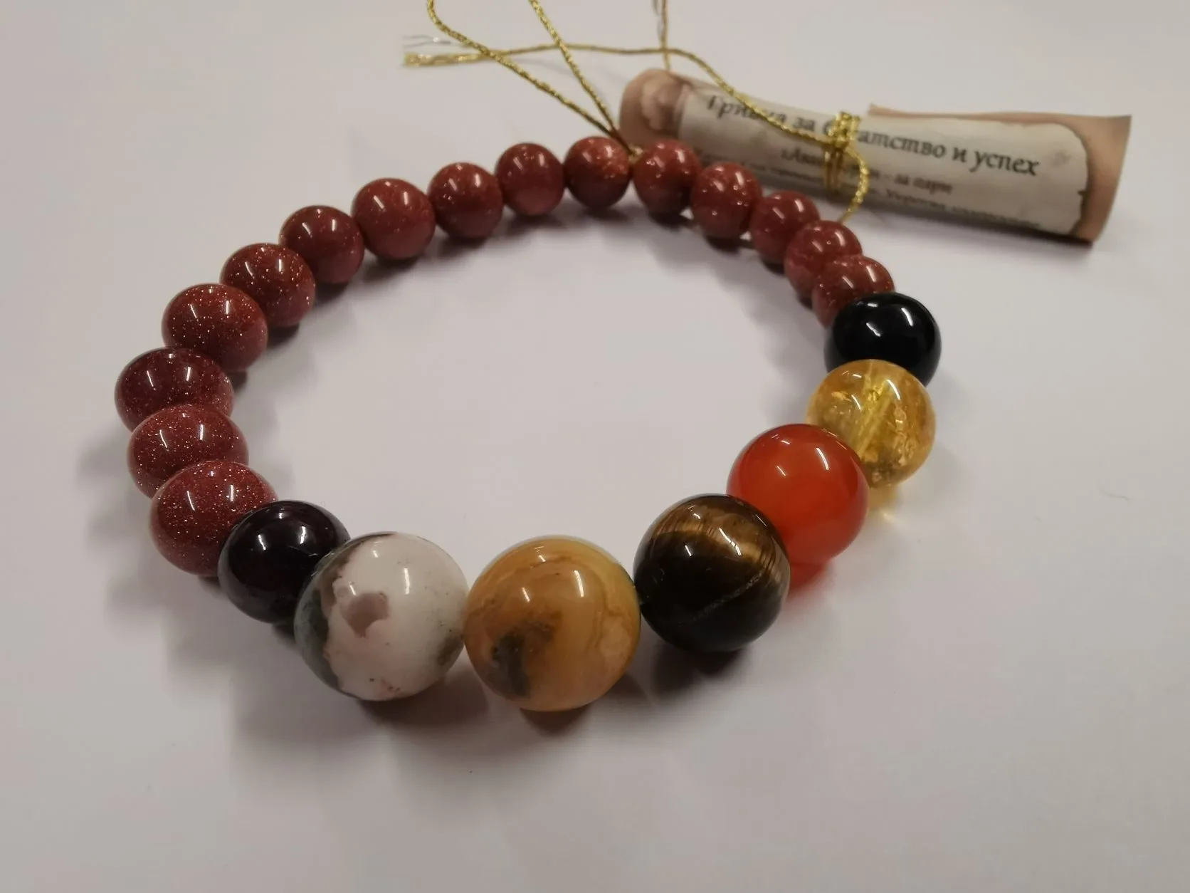 Гривна за богатство и успех Код – VRWMN261121-2 Камъни в гривната – авантюрин, турмалин, цитрин, тигрово око, карнеол, мъхов ахат, гранат. Характеристики: – Обиколка на гривната – 18 см. Гривната е нанизана на ластик. – размер на камък авантюрин – 7 мм – размер на камък гранат – 7 мм – размер турмалин – 10 мм – размер цитрин – 10 мм – размер тигрово око – 10 мм – размер карнеол – 10 мм – размер мъхов ахат – 10 мм Описание на камъните: Авантюрин – за пари. Камъка на просперитета. Укрепва лидерските качества и решимостта. Турмалин – носи благополучие и изобилие, помага при вземането на решения при специфични проблеми. Цитрин – камъка на благополучието. Учи как да привличаме богатство и успехи и всякакви добри неща. Тигрово око – носи успех в бизнеса, преговори, сделки. Камък за търговци, адвокати, счетоводители, ученици, студенти. Тигровото око помага за постигане на целите. Карнеол – дава кураж, провокира благоприятните житейски възможности, мотивира за успехи в бизнеса и други сфери. Мъхов ахат – камъка на богатството. Привлича изобилие, засилва вярата, надеждата и оптимизма. Гранат – внася жизненост и страст, носи успех в бизнес делата, изостря възприятията.
