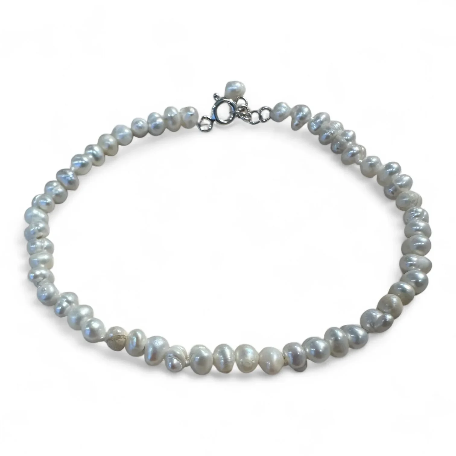 Ръчно изработена гривна от естествени речни перли, нанизана на копринен конец с възли между всяка перла. Тази технология предотвратява търкането на перлите една в друга, съответно удължава живота на изделието.