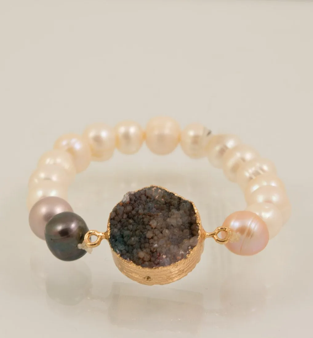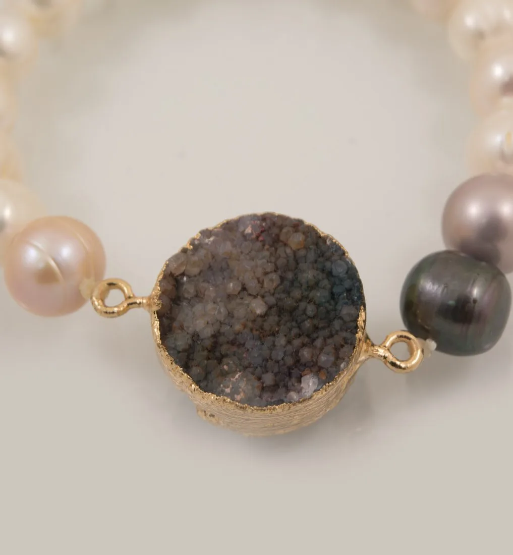 Уникална  и стилна тази гривна от естествени речни перли и кварцова друза е истинско изкушение за всяка една дама. Гривната зарежда с положителна енергия. Носи любов, вяра, почтенност и лоялност. Тя обединява всичко, от което се нуждаете. Направете си подарък и изглеждайте ослепително във всяка ситуация.