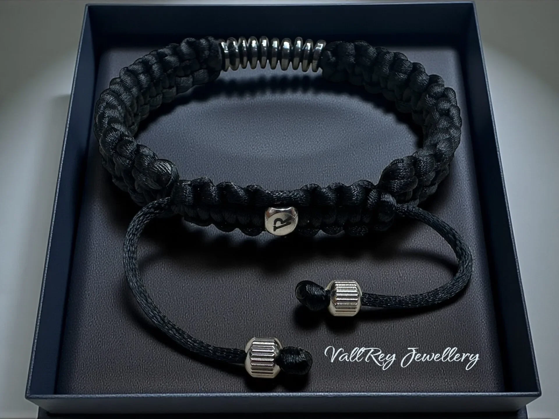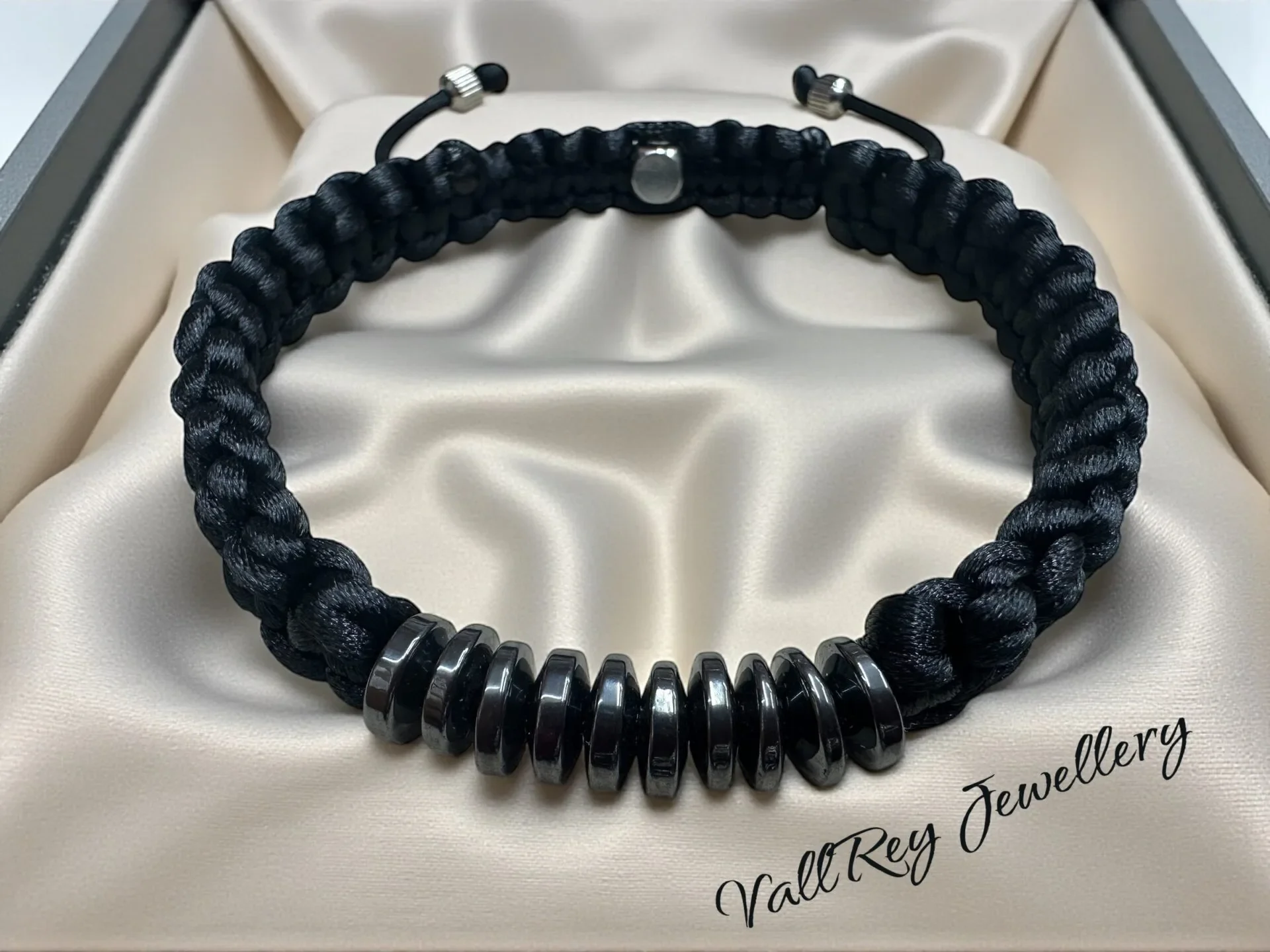 Ръчно изработена гривна от висококачествен черен сатен, сплетен в стил Shamballa.