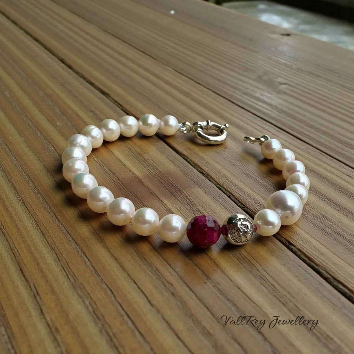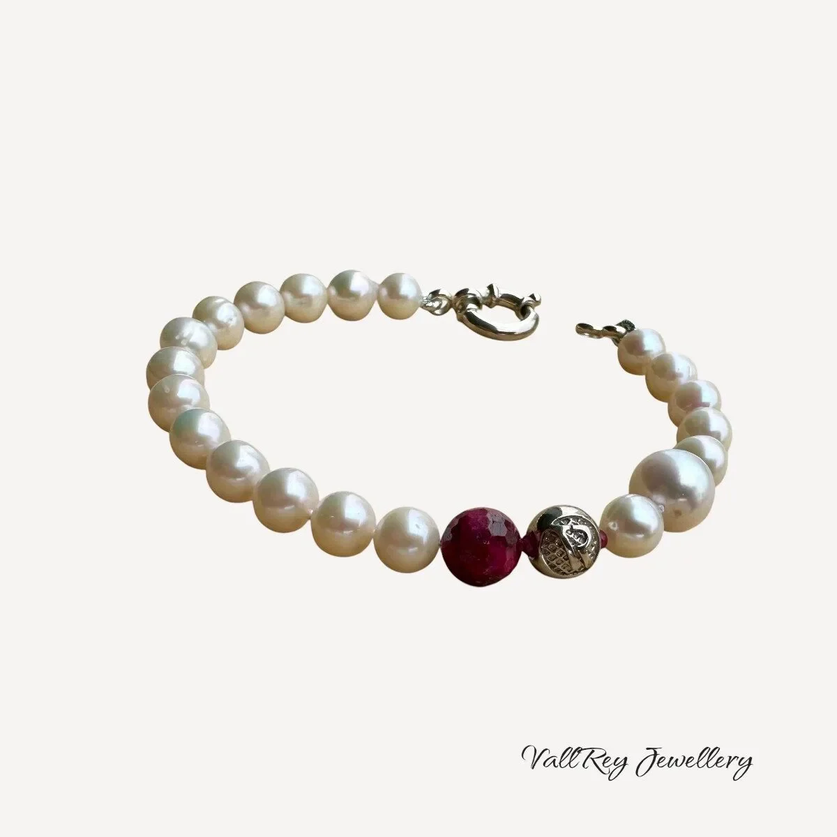 Тази дамска гривна е въплъщение на класическа елегантност и жива емоция – перлите, символ на чистота, хармония и женственост, се срещат с рубина, камъкът на любовта, страстта и вътрешната сила. Бижу с фин характер и дълбоко послание, създадено за жени с меко присъствие и силно сърце.
