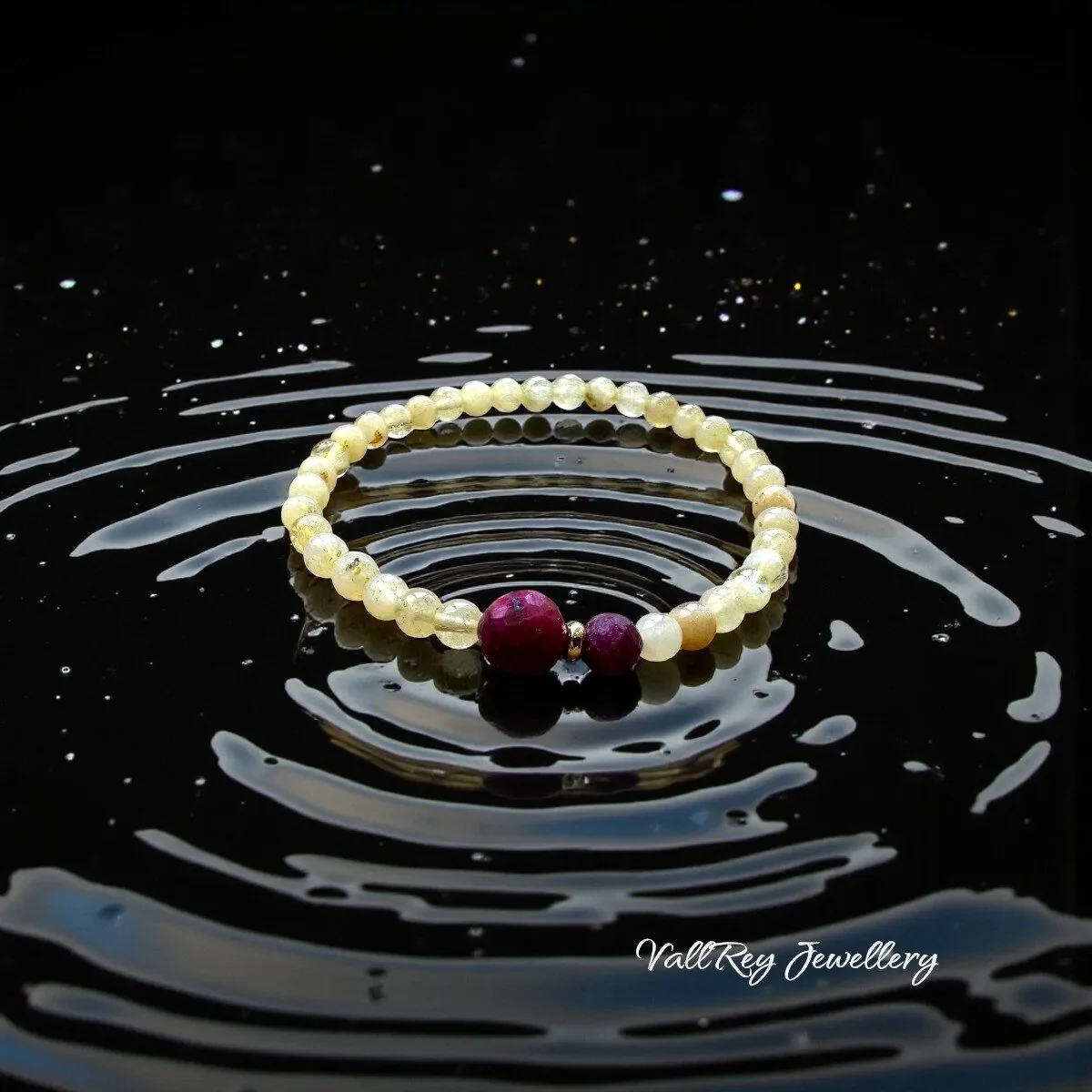 Комбинацията между цитрин и рубин е внимателно подбрана, за да създаде усещане за лукс, топлина и вътрешен баланс. Златистата светлина на цитрина омекотява огнения характер на рубина, превръщайки гривната в елегантен акцент с дълбока символика.