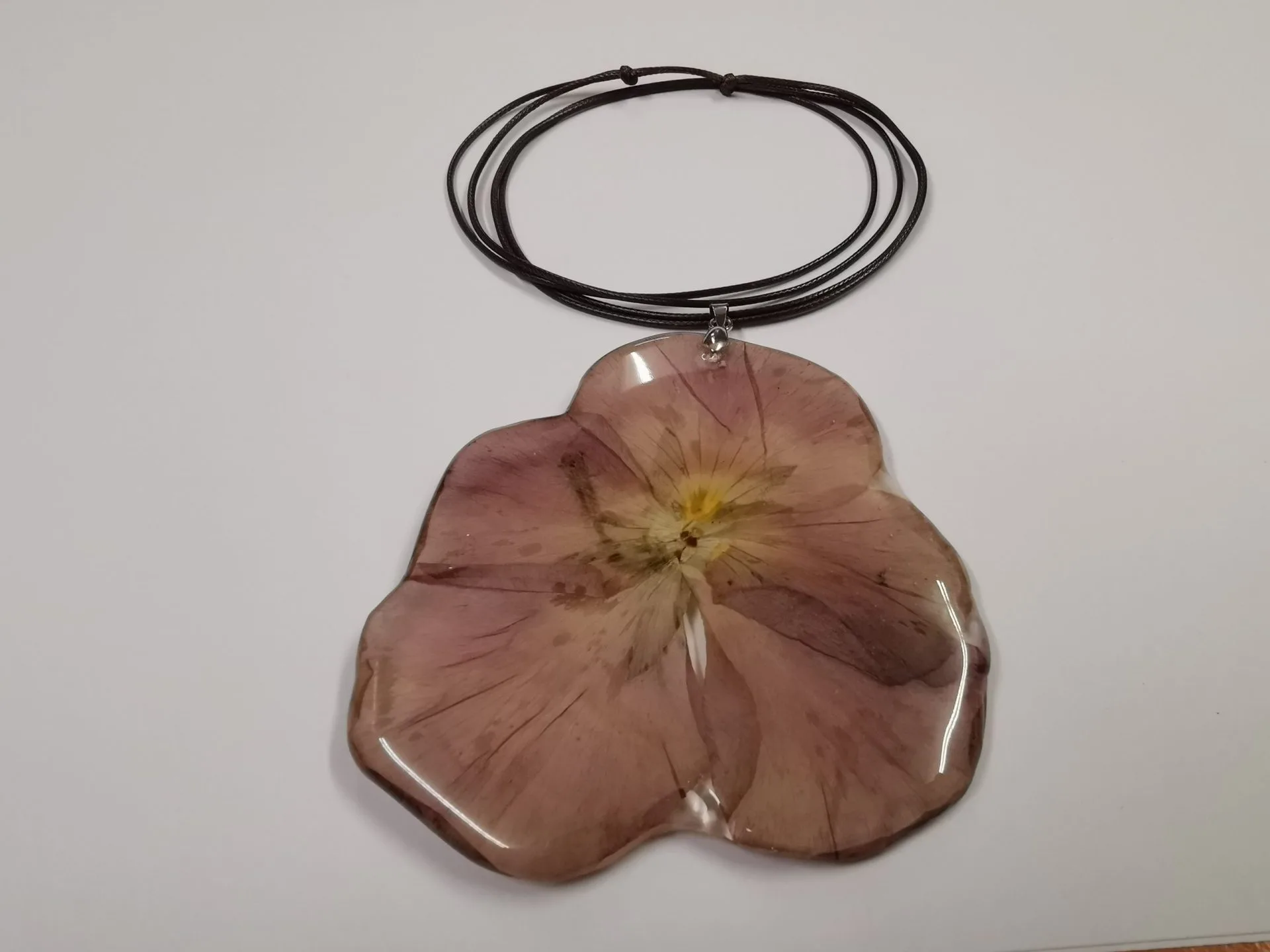 Колието „Кафява Теменужка“ е изработено от епоксидна смола и естествена кафяво-лилава теменужка. Верижката на колието е от еко кожа, цвят кафяв и е подвижен тип. В най-късия вариант верижката е 38 см, в най-дългия 75 см. По Ваше желание колието може да се изработи с друг цвят верижка.