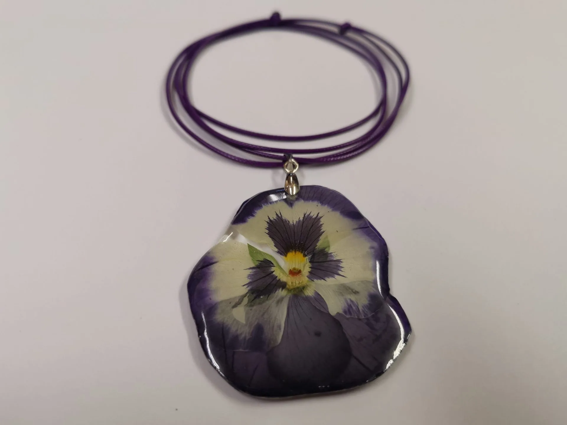 Колието „Лилава Теменужка“ е изработено от епоксидна смола и естествена лилаво-кремава теменужка. Верижката на колието е от еко кожа, цвят лилав и е подвижен тип. В най-късия вариант верижката е 38 см, в най-дългия 75 см. По Ваше желание колието може да се изработи с друг цвят верижка.