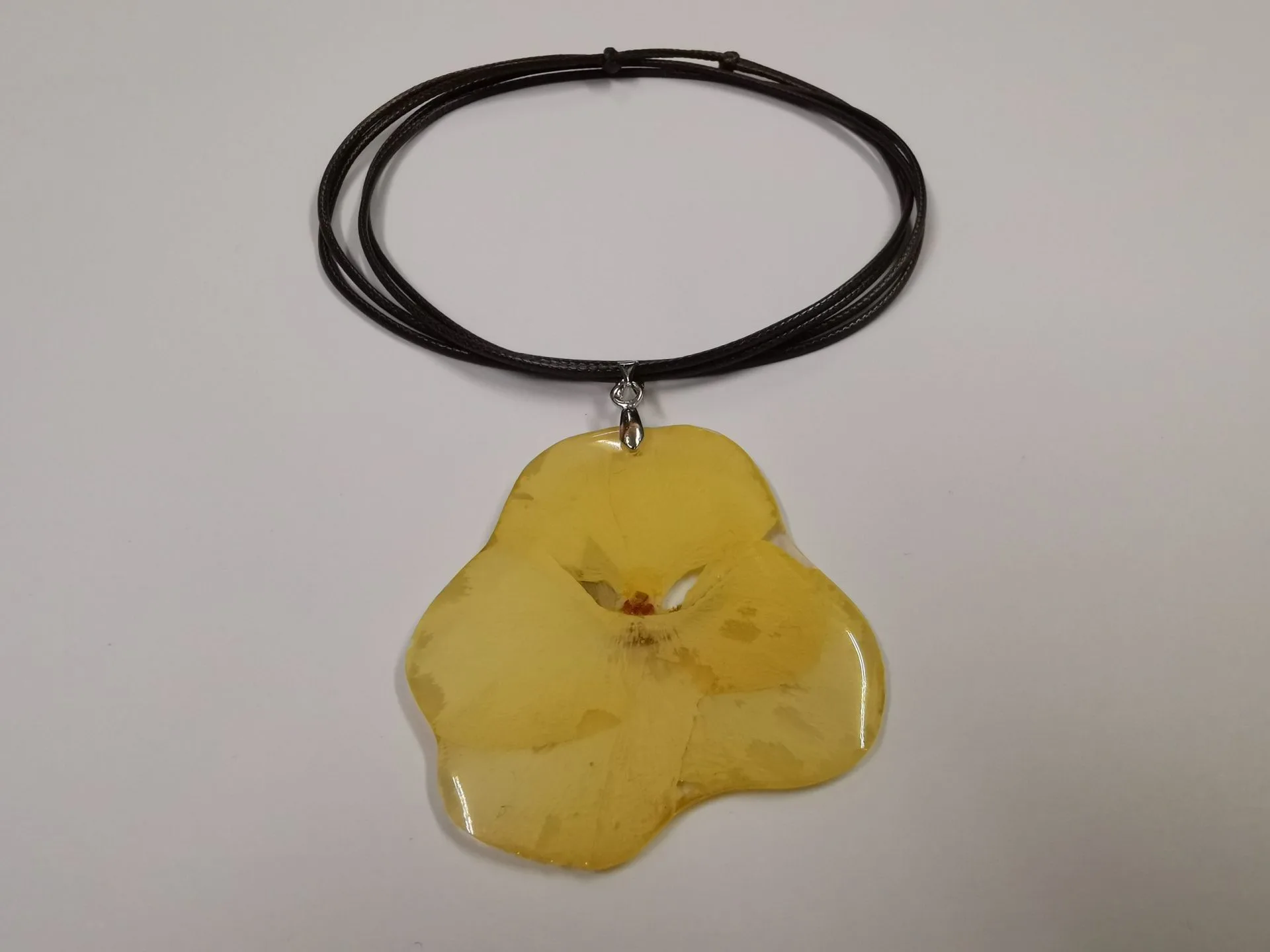 Колието „Малка жълта Теменужка“ е изработено от епоксидна смола и естествена малка жълта теменужка. Верижката на колието е от еко кожа, цвят оранжев и е подвижен тип. В най-късия вариант верижката е 38 см, в най-дългия 75 см. По Ваше желание колието може да се изработи с друг цвят верижка.