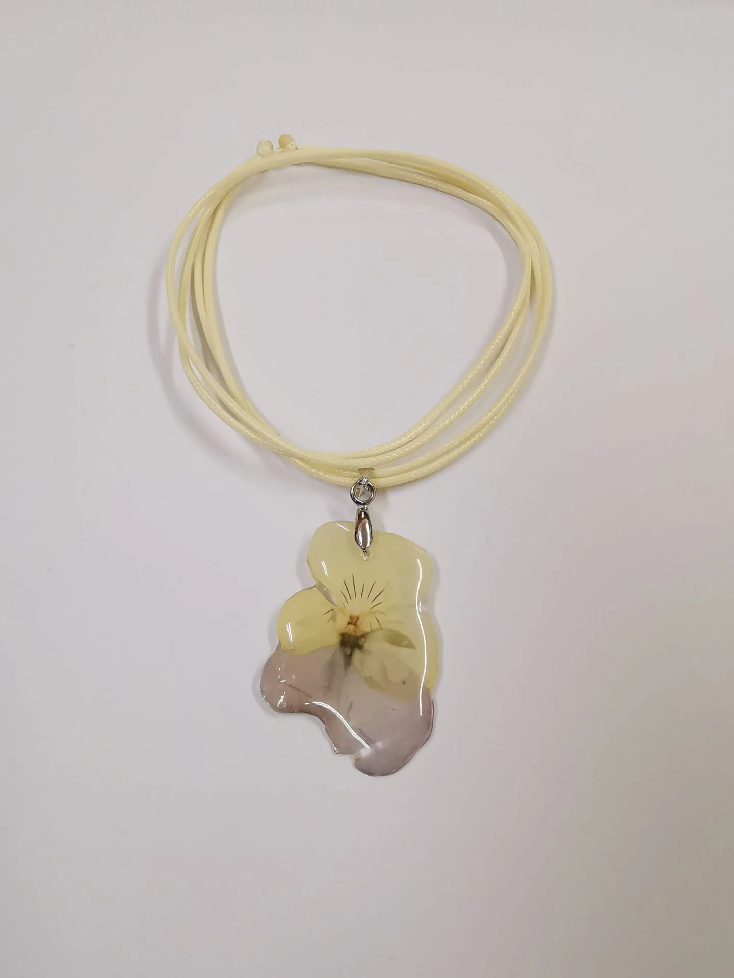 Колието „Мини Теменужка“ е изработено от епоксидна смола и естествена малка кремаво-лилава теменужка. Верижката на колието е от еко кожа, цвят кремав и е подвижен тип. В най-късия вариант верижката е 38 см, в най-дългия 75 см. По Ваше желание колието може да се изработи с друг цвят верижка.