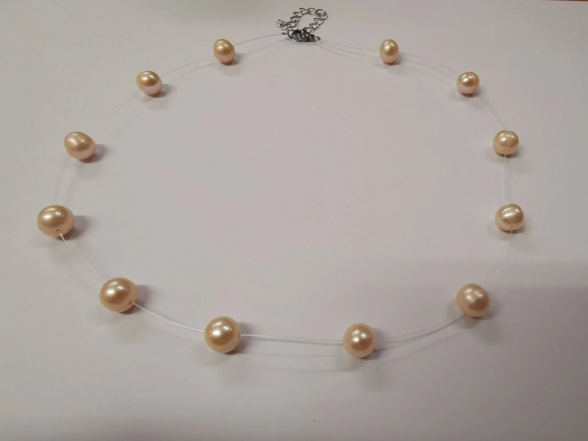 Колието на корда с естествени прасковени перли е ръчно изработено на корда от 0.5мм. Перлите са позиционирани през 2 – 2,50 см. Закопчалката и удължителя са изработени от медицинска стомана 316L, която не причинява алергии. Изключително нежното колие може да бъде изработено и в други варианти. Ние като производители предлагаме на клиентите ни огромен набор от възможности. Колието може да се изработи с различен цвят, големина и/или брой на перлите, различни комбинации между цветовете и големините на перлите. Също така можем да изработим колието с различна дължина и различна закопчалка – цвят, големина, вид метал. Всичко това е Ваш избор. Ако желаете да закупите подобно на това колие (по ваш избор) добавете това колие в кошницата си, след това прегледайте кошницата си и натиснете бутона „Приключване на поръчката“, след това в полето „Допълнителна информация“ напишете бележка, че искате модел по Ваш избор. Наш представител ще се свърже с вас и ще уточните поръчката си.