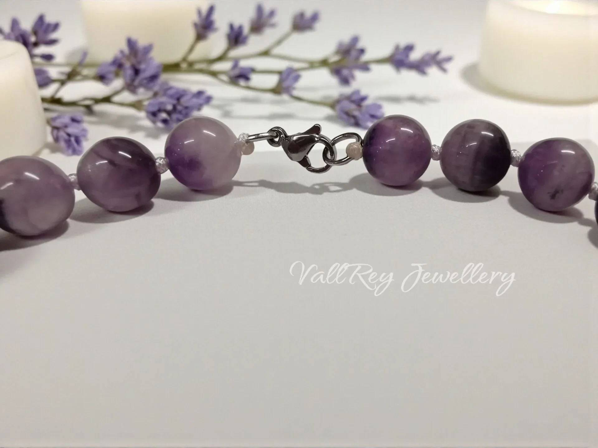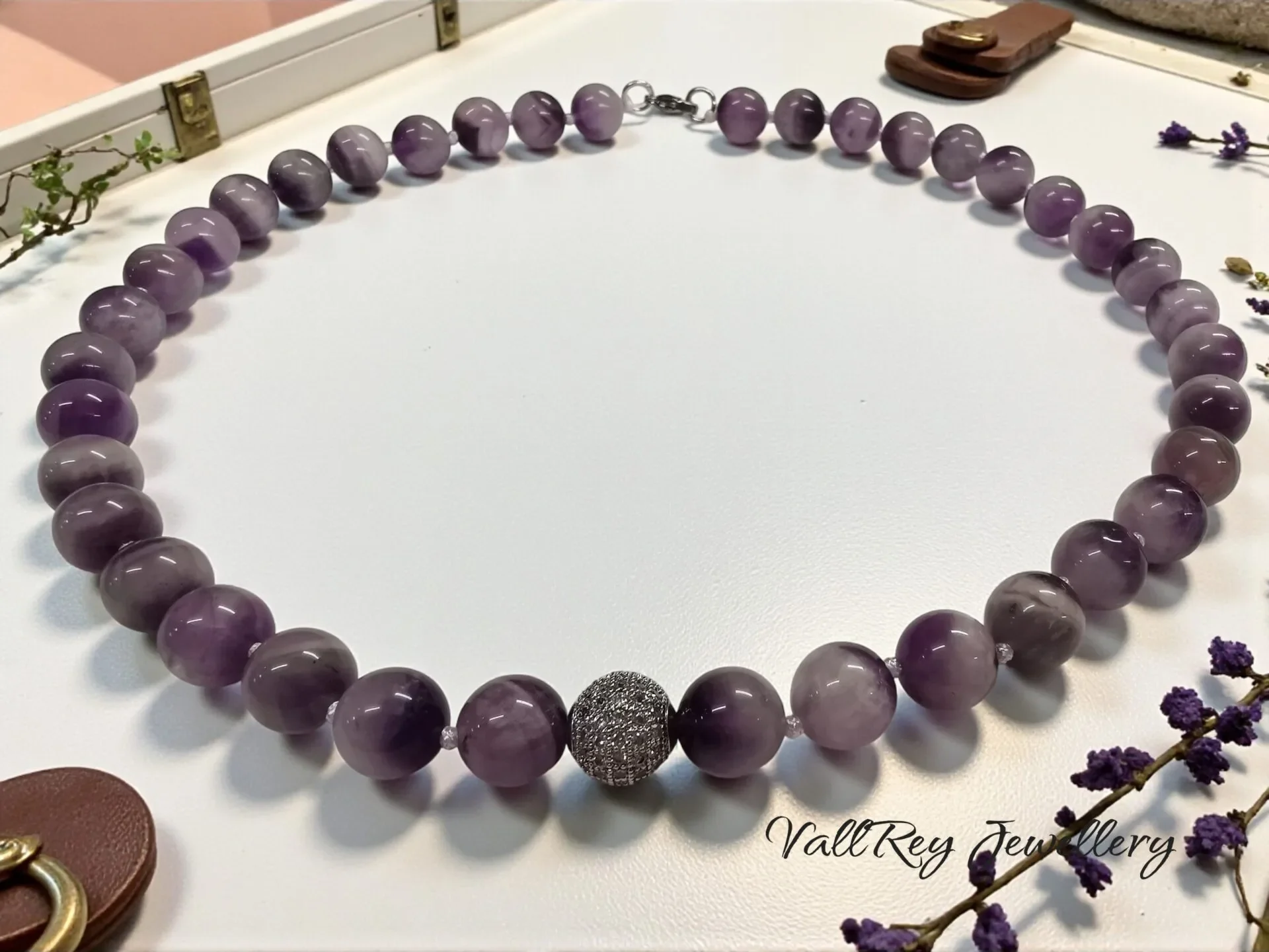 Изискано колие, изработено от естествен аметист с перфектно полирани мъниста с диаметър 10 мм, комбинирани с една сферичен циркон (10 мм), който придава сияен акцент на композицията. Закопчалката е карабинка от неръждаема стомана, осигуряваща дълготрайност, надеждност и елегантно излъчване.