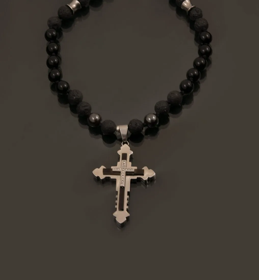 Ръчно изработено мъжко колие от естествени полускъпоценни камъни със стоманена висулка – кръст и стоманени елементи. Колието е изработено от конец с възли.
