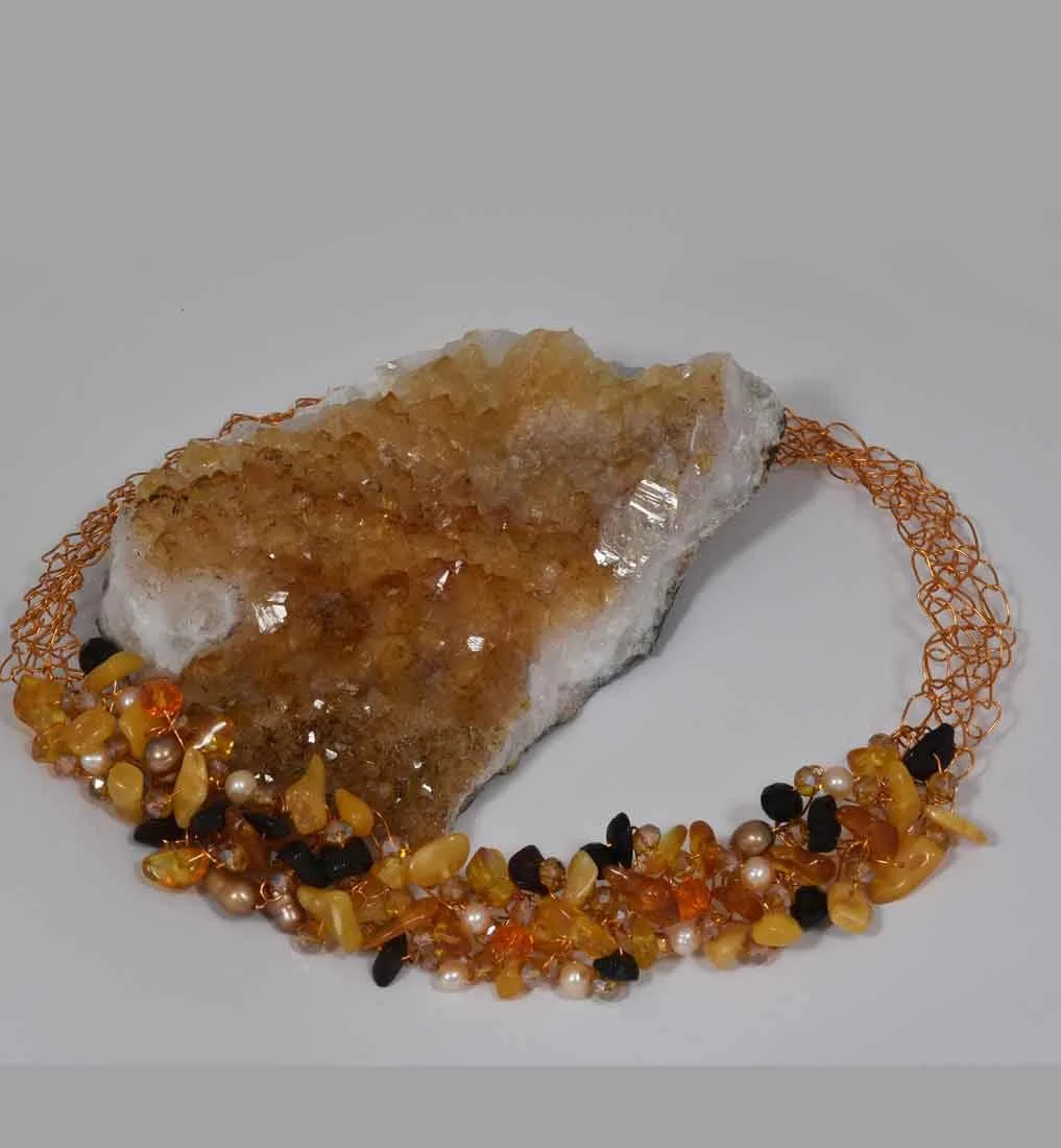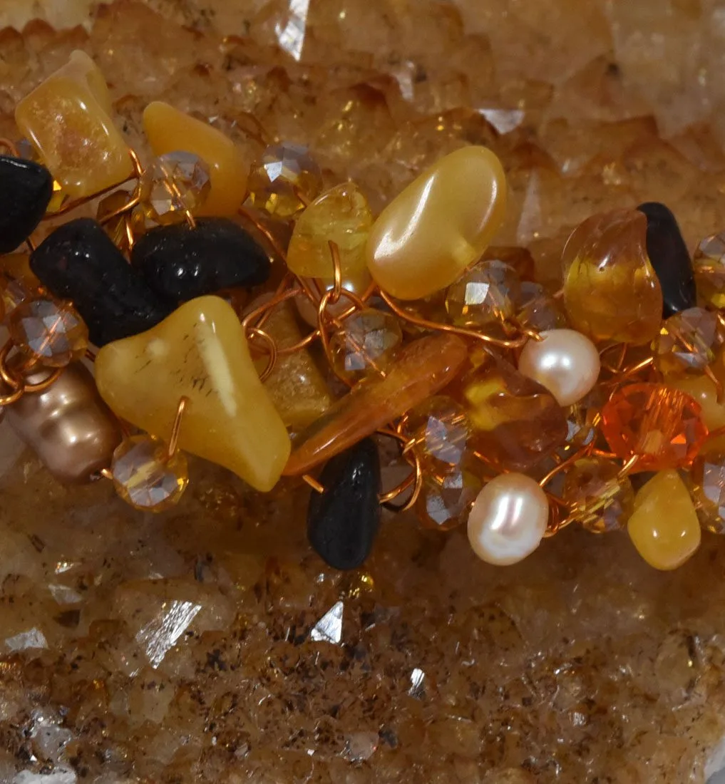 Ръчно изработено колие от естествени перли, кехлибар и кристали.