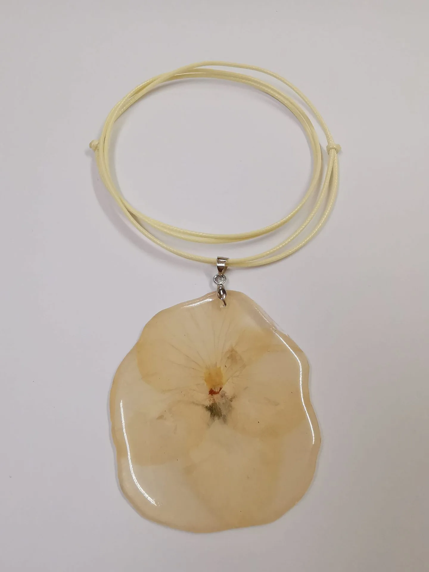 Колието от кремава Теменужка е изработено от епоксидна смола и естествена кремава теменужка. Верижката на колието е от еко кожа, цвят кафяв и е подвижен тип. В най-късия вариант верижката е 38 см, в най-дългия 75 см. По Ваше желание колието може да се изработи с друг цвят верижка.