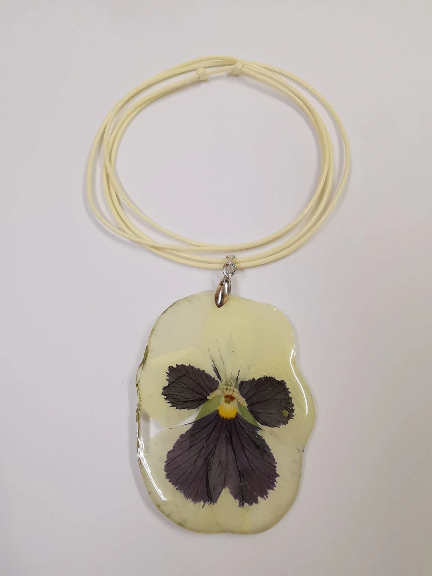 Колие от кремаво-лилава Теменужка е изработено от епоксидна смола и естествена кремаво-лилава теменужка. Верижката на колието е от еко кожа, цвят крем и е подвижен тип. В най-късия вариант верижката е 38 см, в най-дългия 75 см. По Ваше желание колието може да се изработи с друг цвят верижка.
