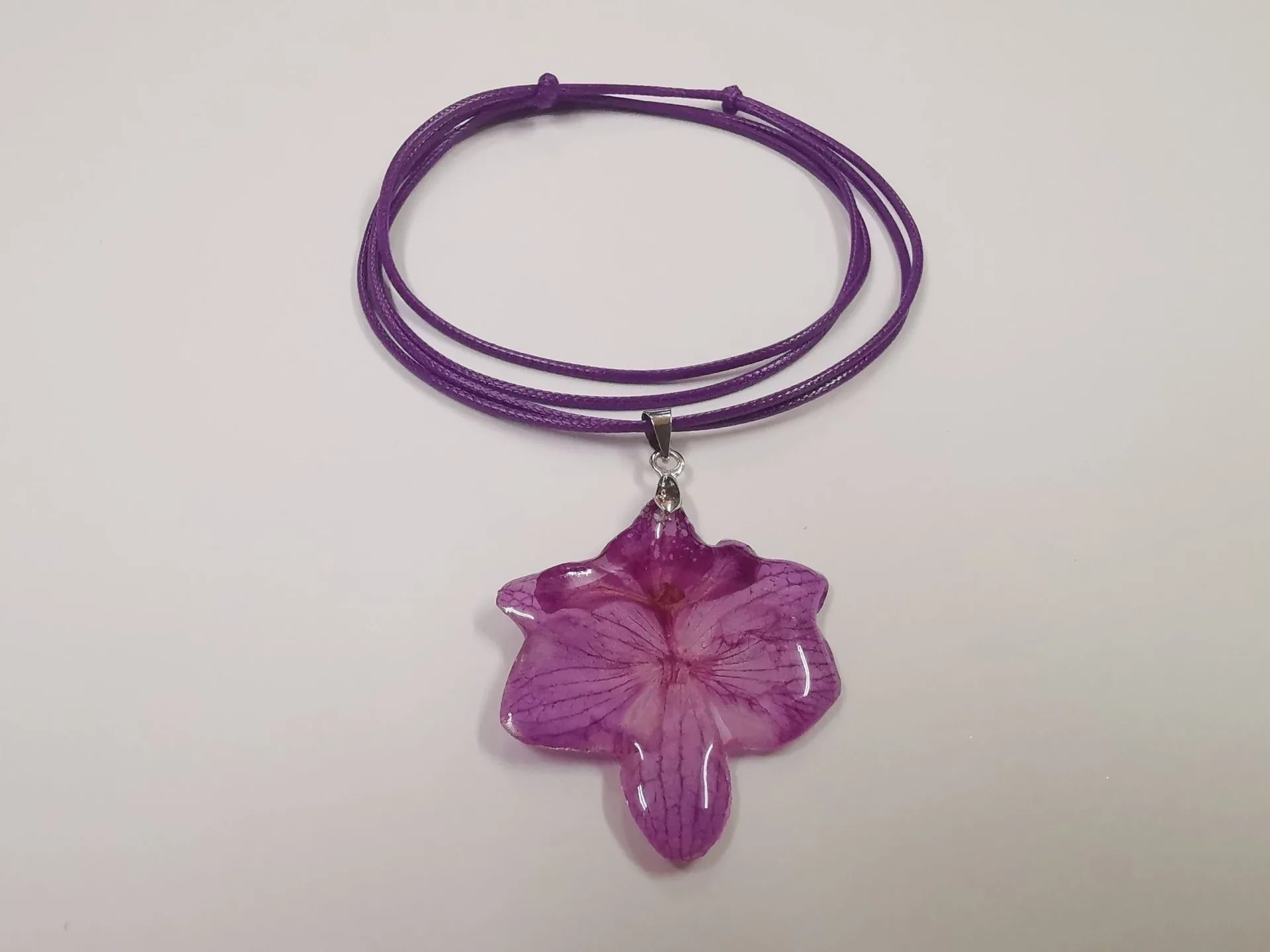 Колието от мини Орхидея е изработено от епоксидна смола и естествена малка лилава орхидея. Верижката на колието е от еко кожа, цвят лилав и е подвижен тип. В най-късия вариант верижката е 38 см, в най-дългия 75 см. По Ваше желание колието може да се изработи с друг цвят верижка.