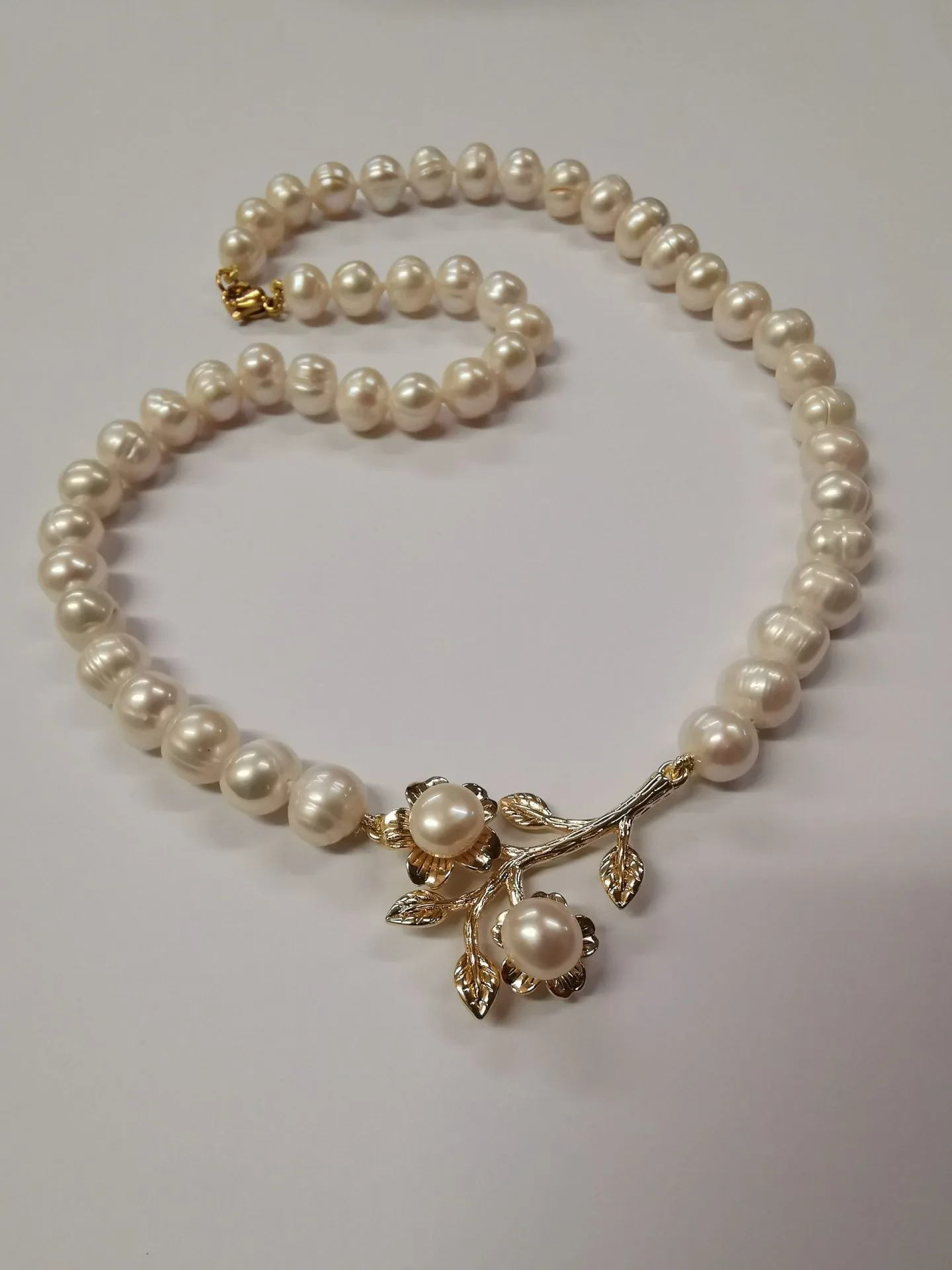 Дамско колие от речни перли и позлатен месингов елемент.