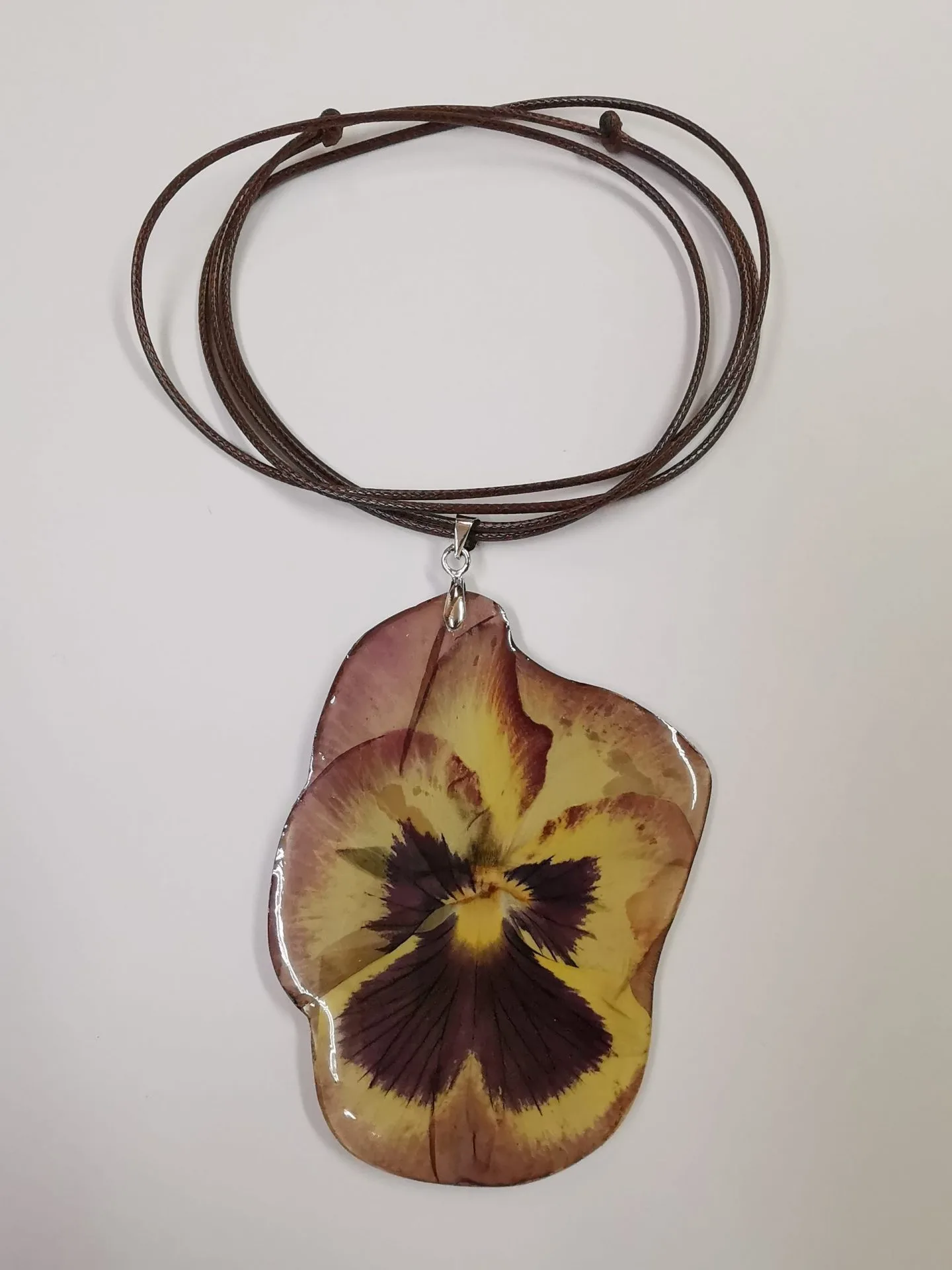 Колие от теменужка „Кафява Магия“ е изработено от епоксидна смола и естествена кафяво-жълта теменужка. Верижката на колието е от еко кожа, цвят кафяв и е подвижен тип. В най-късия вариант верижката е 38 см, в най-дългия 75 см. По Ваше желание колието може да се изработи с друг цвят верижка.
