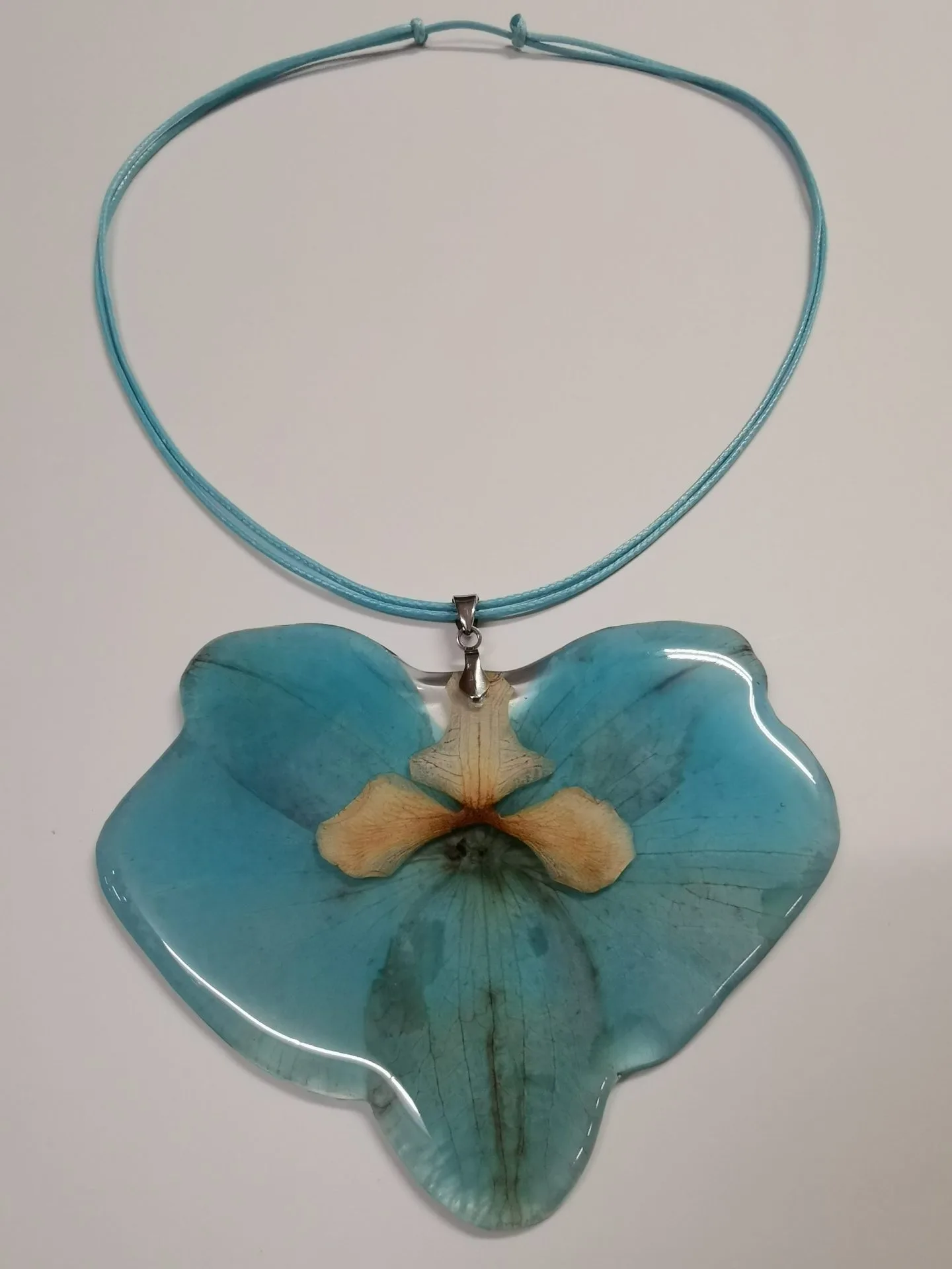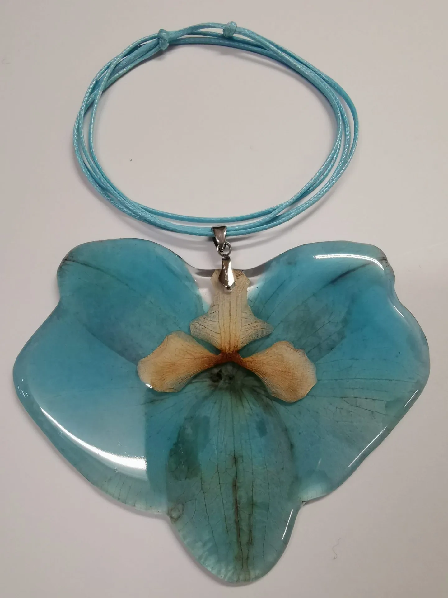 Колие „Синя Орхидея“ е изработено от епоксидна смола и естествена синя орхидея. Верижката на колието е от еко кожа, цвят син и е подвижен тип. В най-късия вариант верижката е 38 см, в най-дългия 75 см. По Ваше желание колието може да се изработи с друг цвят верижка.
