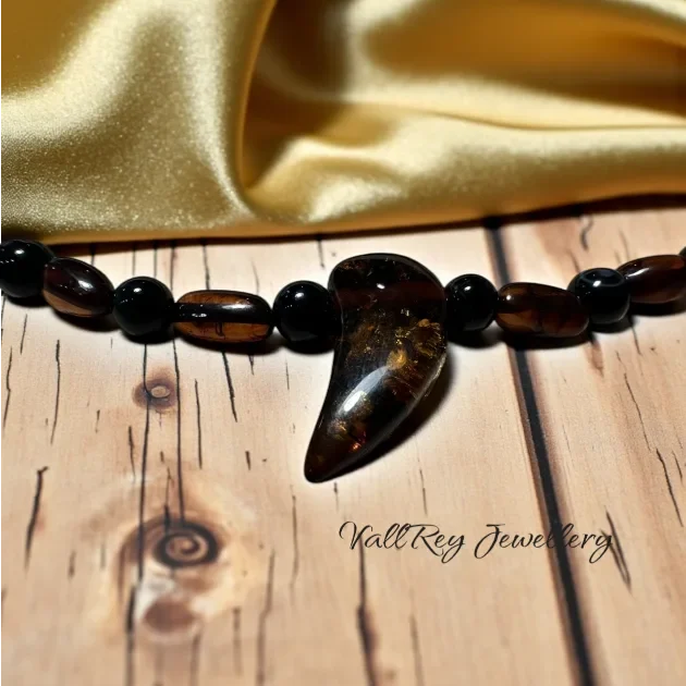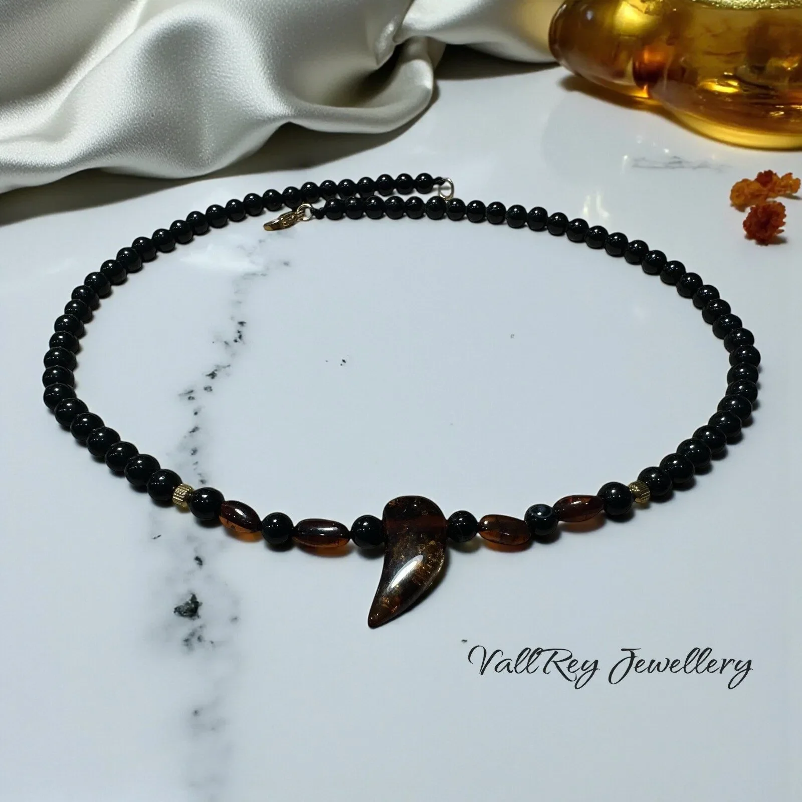 Ръчно изработено мъжко колие от естествен оникс (6 мм)и полирани кехлибарени елементи, акцентът е уникален зъб от кехлибар с размери 1 х 2.5 см. Дължината на колието е 50 см, със завършек от висококачествена стомана с петле за сигурно закопчаване.