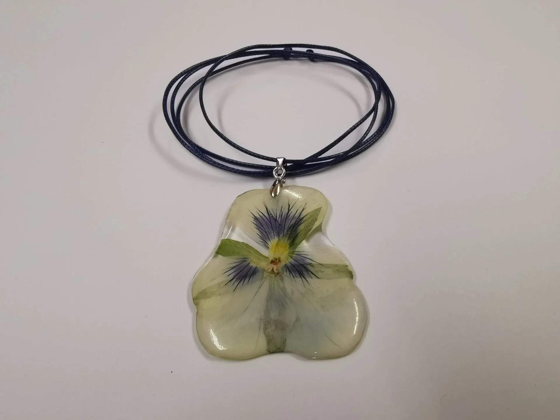 Колието „Теменужка Крем“ е изработено от епоксидна смола и естествена малка кремаво-синя теменужка. Верижката на колието е от еко кожа, цвят тъмносин и е подвижен тип. В най-късия вариант верижката е 38 см, в най-дългия 75 см. По Ваше желание колието може да се изработи с друг цвят верижка.