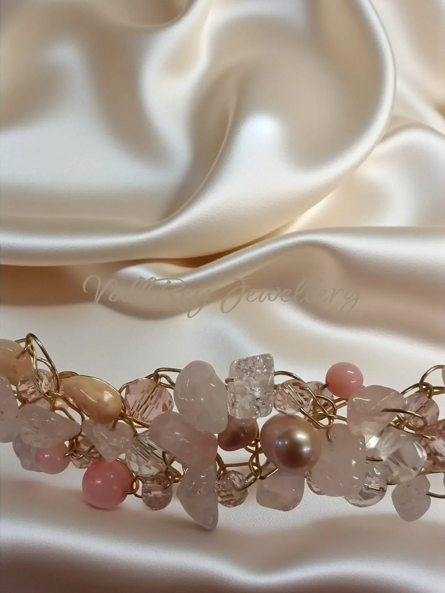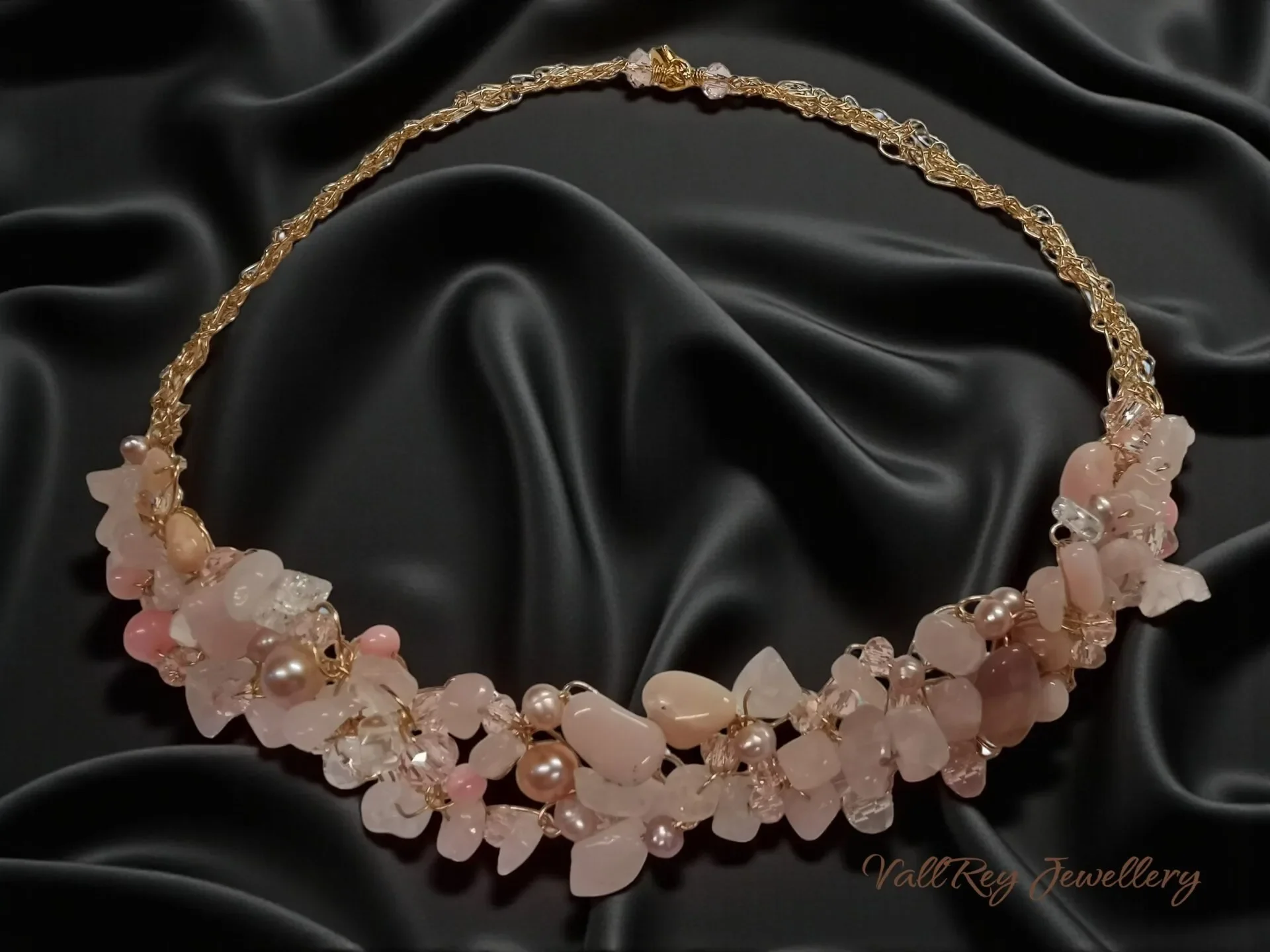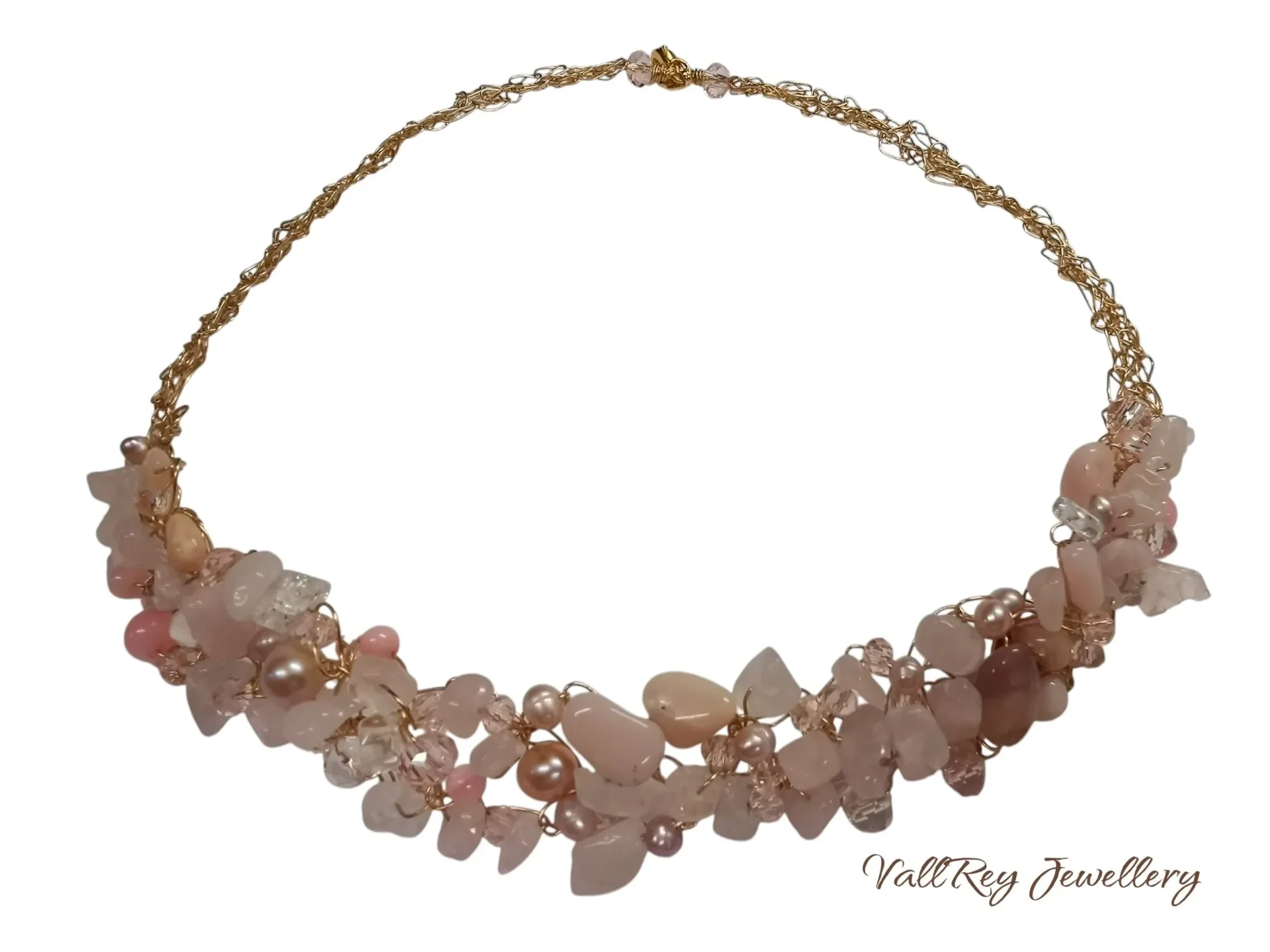 Открийте изяществото на нашето ръчно плетено колие, изработено с внимание към всеки детайл. Това уникално бижу съчетава нежни мъниста от розов опал, розов кварц, естествени речни перли и кристали, придавайки му романтична и елегантна визия.