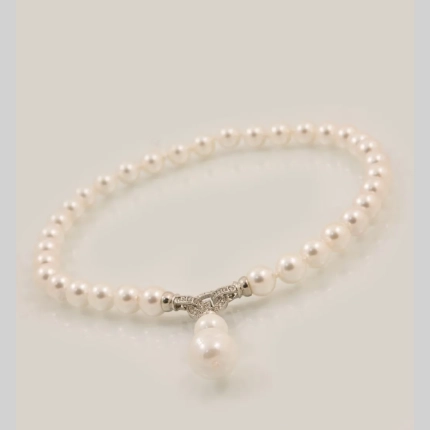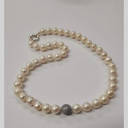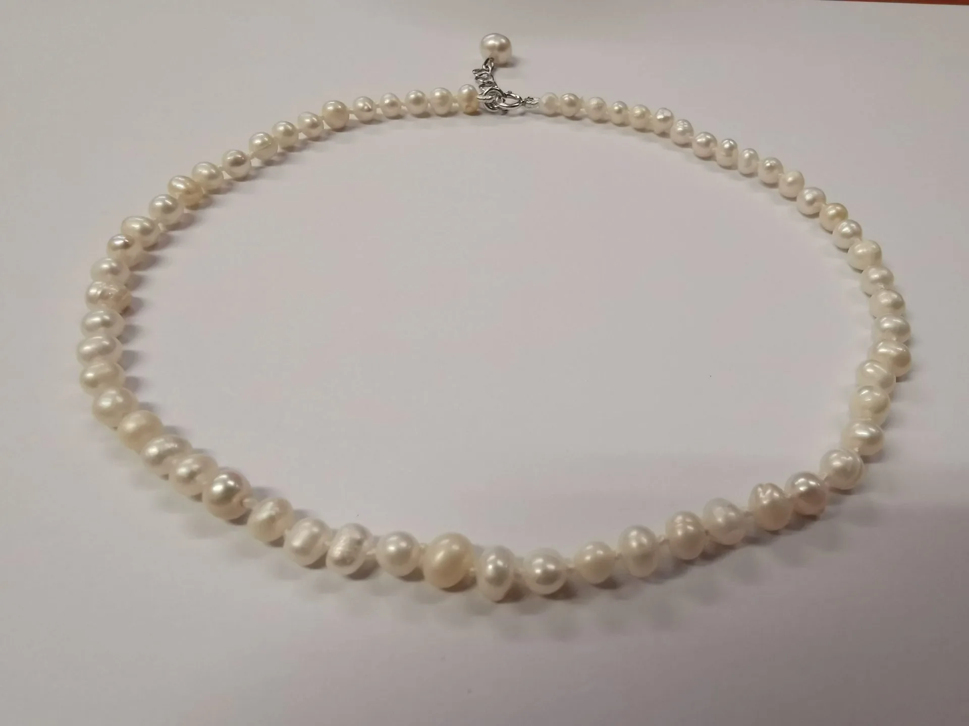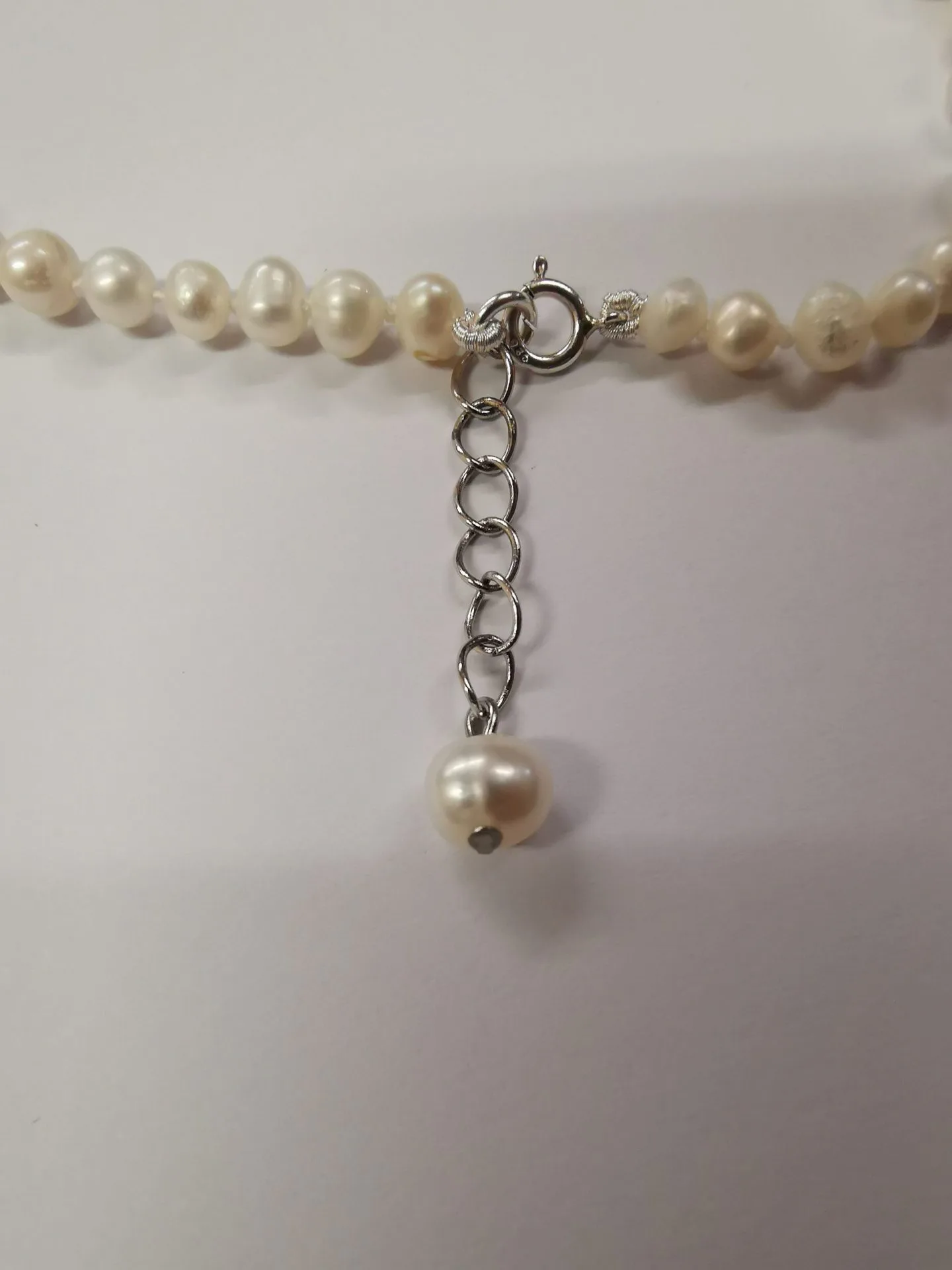 Чокър от бели перли – ръчно изработен чокър от бели речни перли, на копринен конец с възли между всяка перла.Тази технология предотвратява търкането на перлите една в друга, съответно удължава живота на изделието.Чокъра е изработен със сребърна малка закопчалка 925 и удължител от сребро 925. Дължината на удължителя е 2,50см.