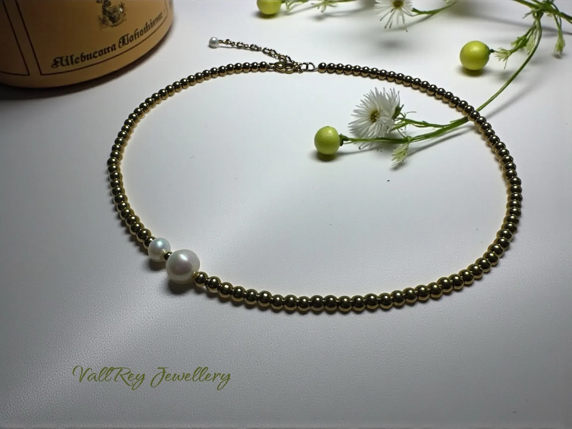 Стилно и елегантно късо колие (чокър), изработено от фини мъниста с диаметър 4 мм. Дължината е 40 см с удобен стоманен удължител от 4 см, който позволява лесно регулиране според предпочитанията. Моделът е акцентиран с две нежни кръгли перли – едната с диаметър 5 мм, другата 10 мм – разположени отстрани, за модерно и балансирано излъчване. Подходящо е както за ежедневна визия, така и за по-специални поводи, придавайки женственост и изтънченост.
